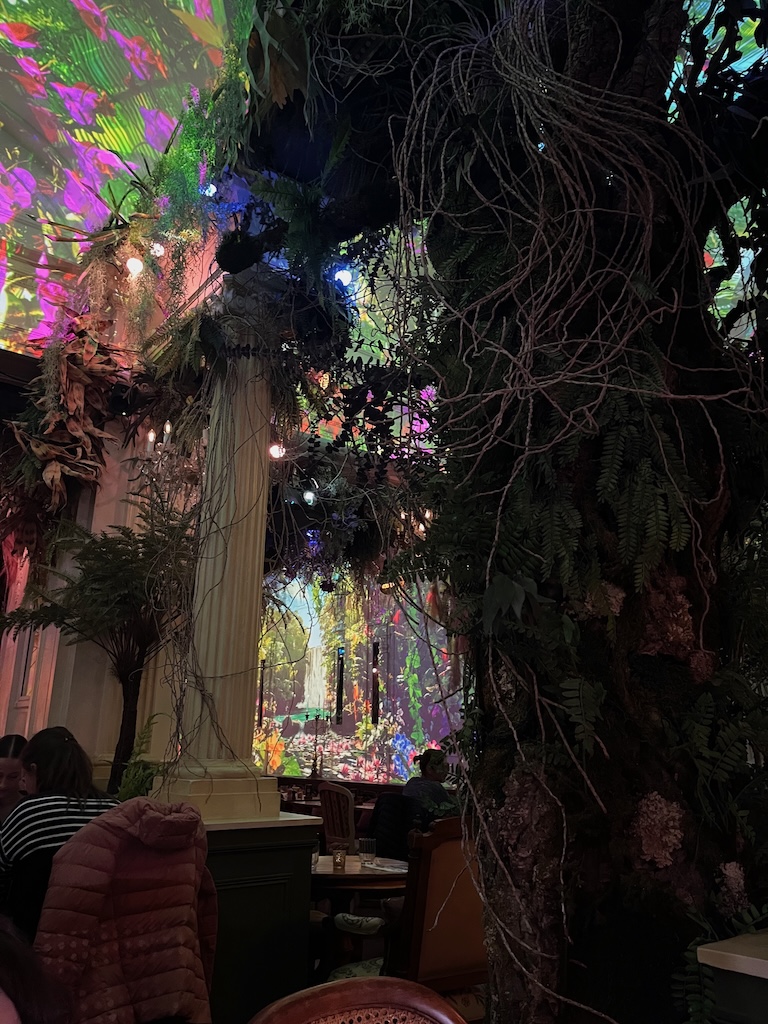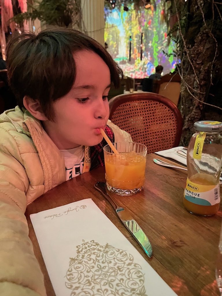 No terceiro, acordamos excitados, pois queríamos muito ir almoçar ao Jungle Palace, um restaurante com um conceito muito inovador onde podemos desfrutar dos sons e imagens da Natureza, situado bem próximo da Gare du Nord. A única coisa que não curtimos foi ser muito escuro e mais conseguíamos ver a comida… mas foi giro e diferente.